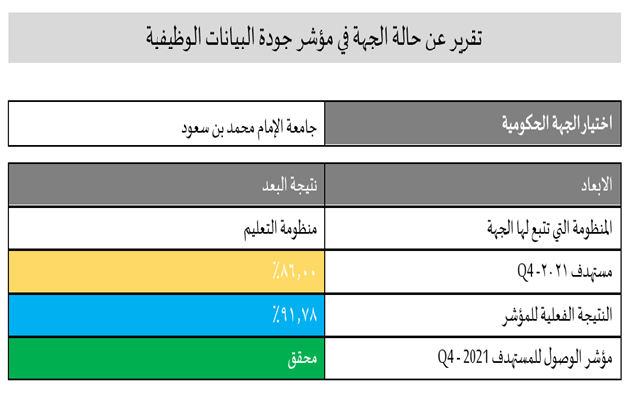 عقدت عمادة الموارد البشرية ممثلة بمساعد العميد لعمليات الموارد البشرية أ. عبدالرحمن العياف ومدير وحدة الدعم الفني م. يوسف المطيري ونائب مدير إدارة التشكيلات أ. أحمد الزهراني وعمادة تقنية المعلومات ممثلة بمدير إدارة التطبيقات م. عبدالله الحازمي و م. إبراهيم أبوشمس ورشة عمل مع وزارة الموارد البشرية والتنمية الاجتماعية للاطلاع على نتائج مؤشر جودة البيانات الوظيفية، حيث حققت الجامعة بجهود فريق العمل (91.78%) من أصل المستهدف للعام 2021م (86.00%).