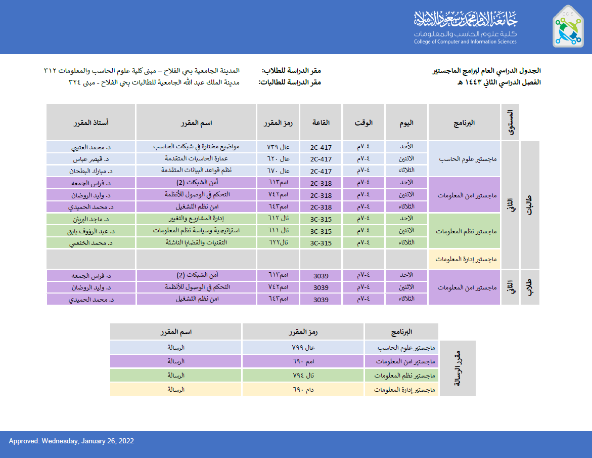 الجدول الدراسي لمرحلة الماجستير (العام) للفصل الدراسي الثاني للعام 1443 ه