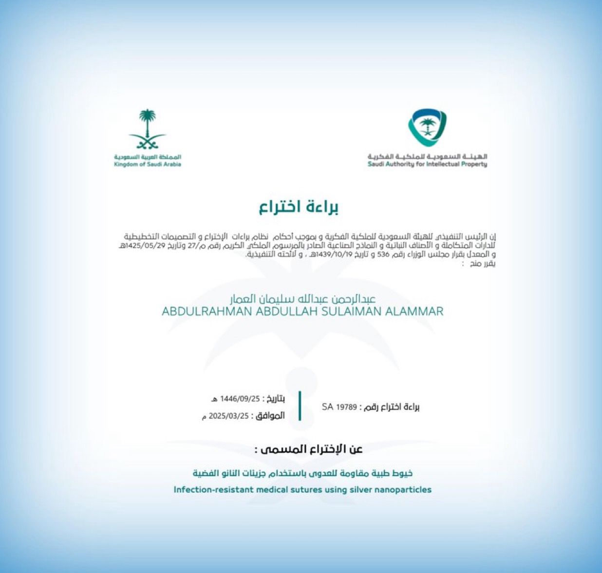 يتقدم عميد ومنسوبو ⁧‫#كلية_الطب_بجامعة_الإمام‬⁩ بخالص التهنئة لطالب الكلية عبدالرحمن بن عبدالله العمار بمناسبة حصوله على براءة إختراع من الهيئة السعودية للملكية الفكرية عن اختراعه ،