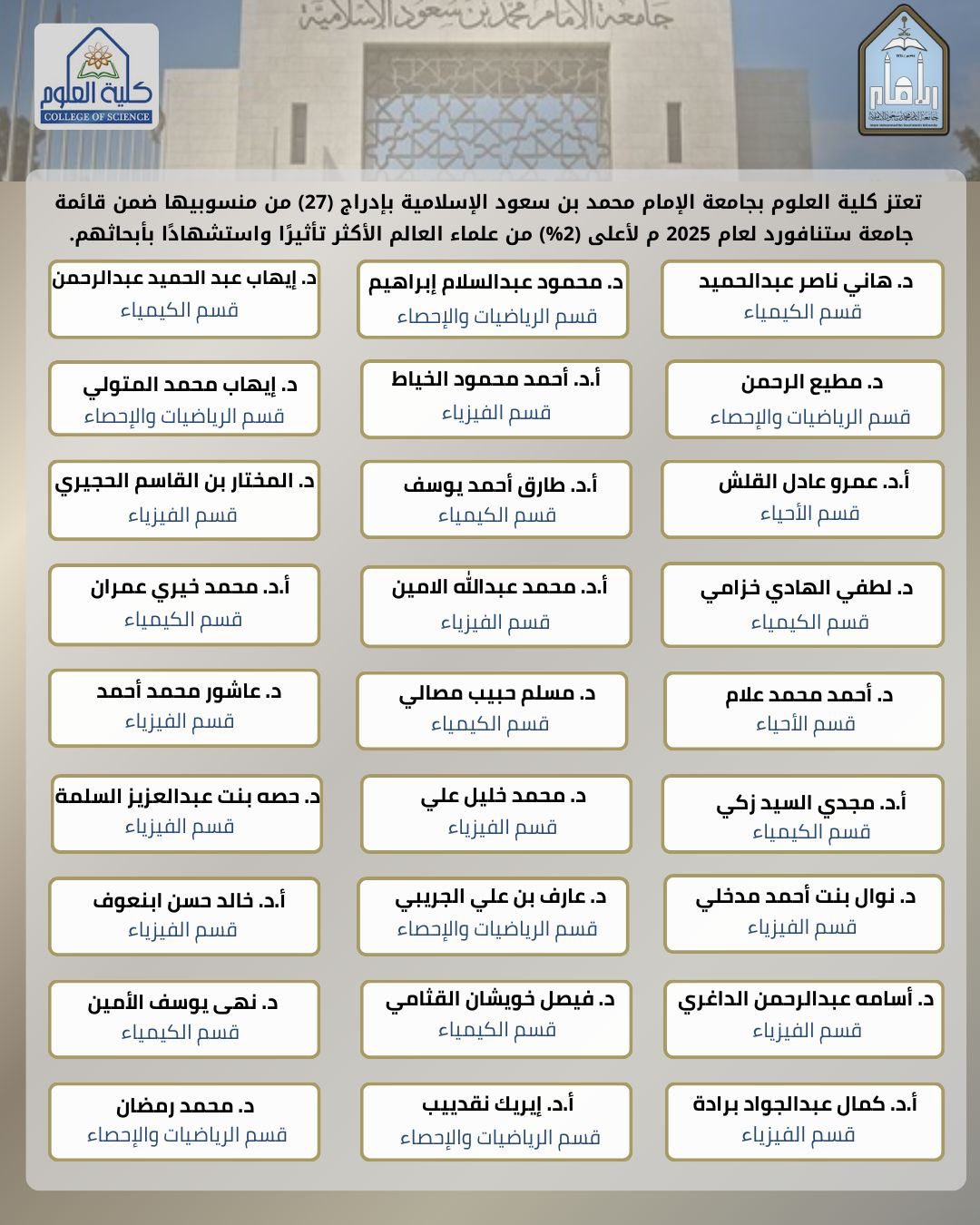 وقد سجلت كلية العلوم بجامعة الإمام محمد بن سعود الإسلامية إنجازًا بارزًا هذا العام، بوجود 27 عالمًا من منسوبيها ضمن القائمة، من أصل 41 عالمًا من الجامعة، لتسجّل بذلك النسبة الأكبر من بين علماء الجامعة المدرجين في التصنيف العالمي.
