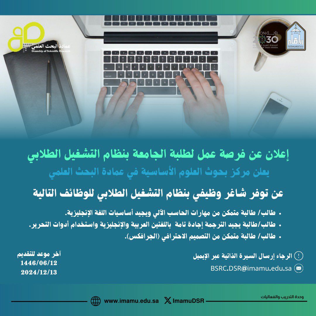 يعلن مركز بحوث العلوم الأساسية في عمادة البحث العلمي عن توفر شاغر وظيفي بنظام التشغيل الطلابي للوظائف التالية: