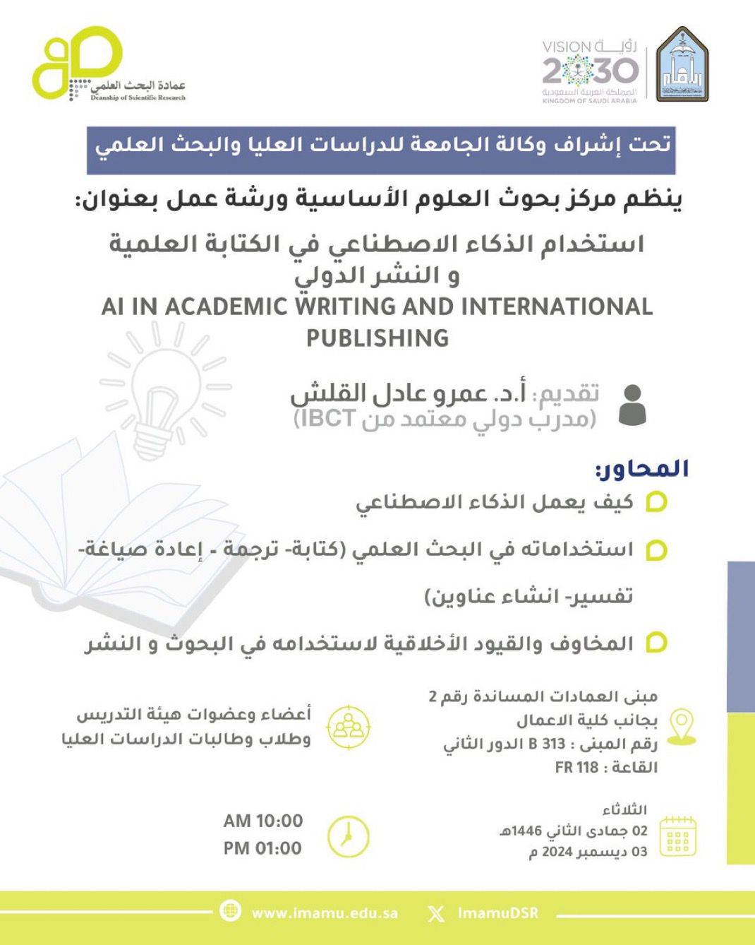 تعلن عمادة البحث العلمي بـ #جامعة_الإمام عن إقامة ورشة عمل ينظمها مركز بحوث العلوم الأساسية بعنوان: