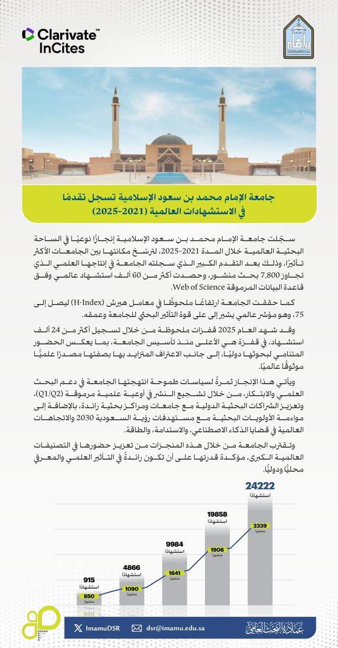 سجّلت جامعة الإمام محمد بن سعود الإسلامية إنجازًا نوعيًا في الساحة البحثية العالمية خلال المدة 2021–2025، لترسّخ مكانتها بين الجامعات الأكثر تأثيرًا، وذلك بعد التقدم الكبير الذي سجلته الجامعة في إنتاجها العلمي الذي تجاوز 7,800 بحث منشور، وحصدت أكثر من 60 ألف استشهاد عالمي وفق قاعدة البيانات المرموقة Web of Science.