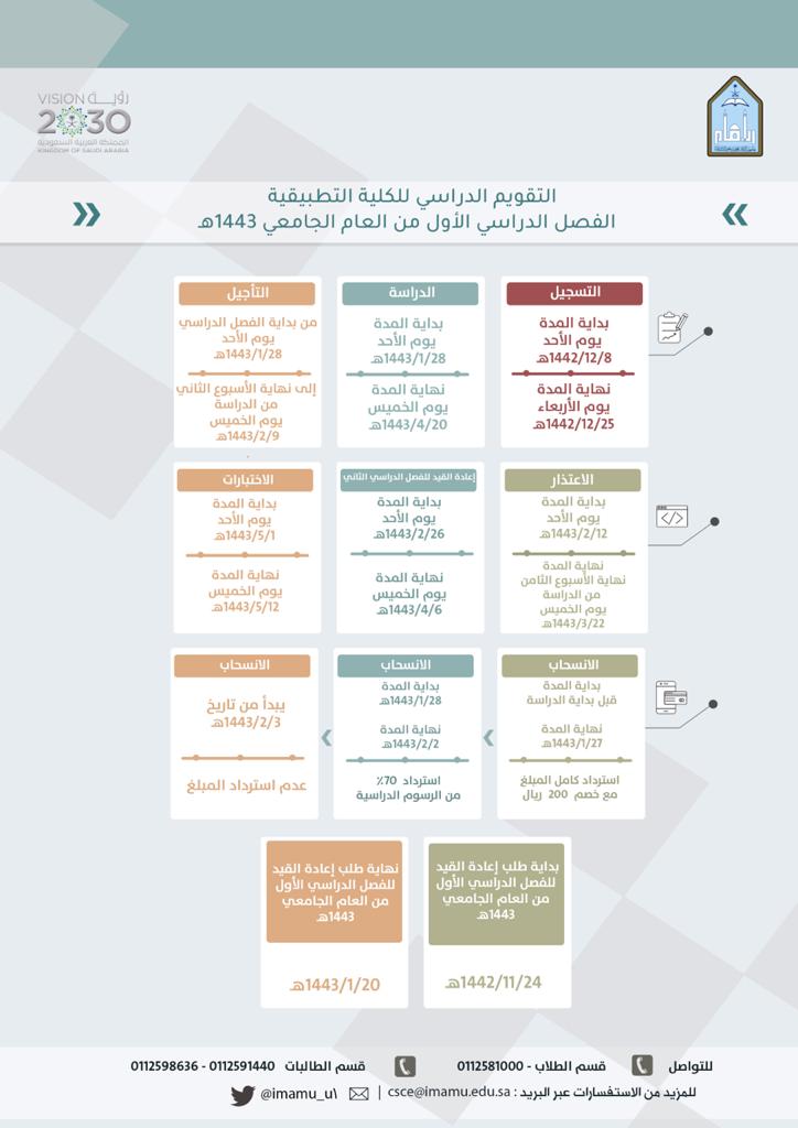 تعلن الكلية التطبيقية بجامعة الامام محمد بن سعود الاسلامية عن فتح التسجيل لبرامج الدبلوم المدفوع للفصل الدراسي الأول من العام الجامعي 1443هـ