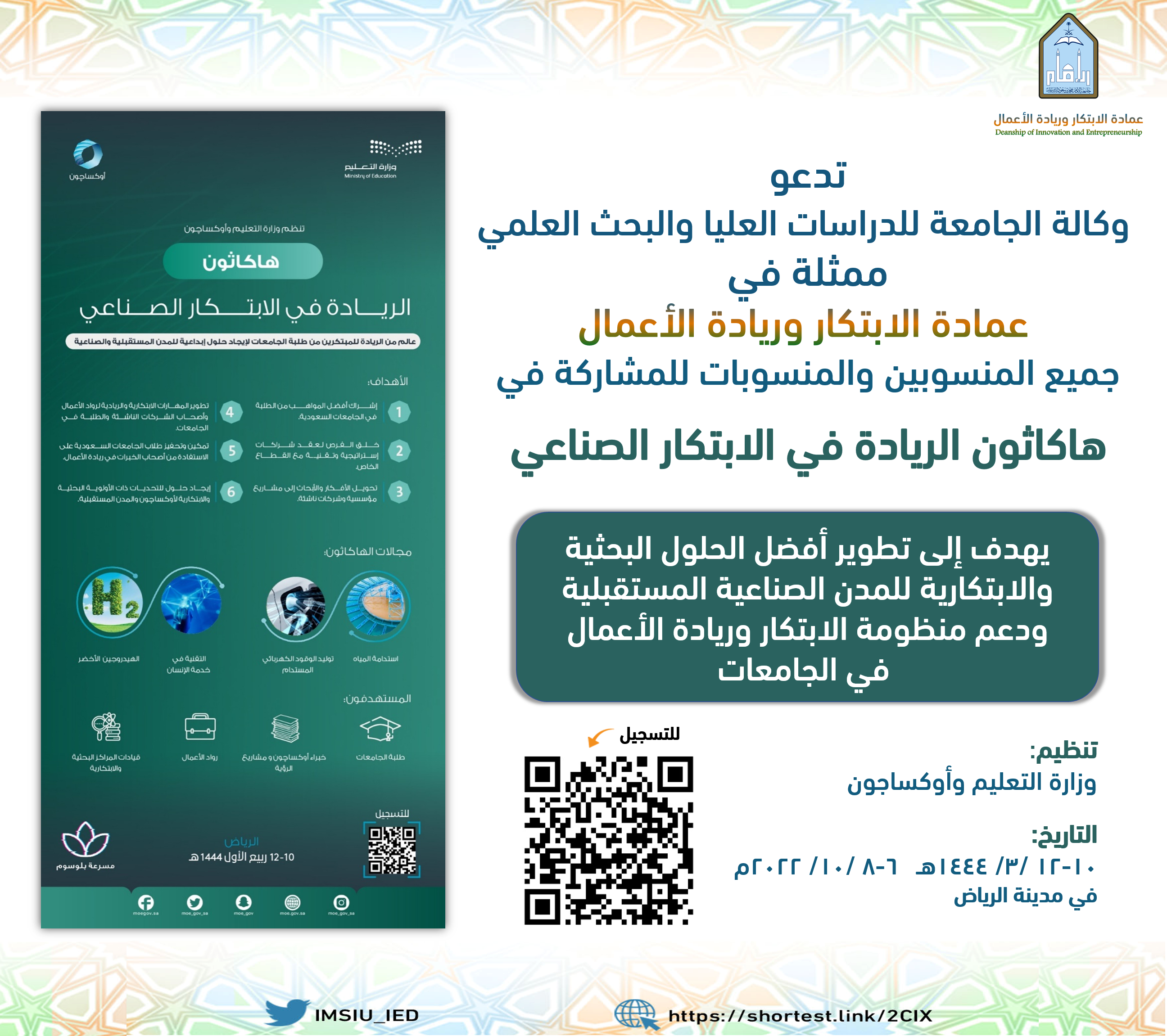 تدعو وكالة الجامعة للدراسات العليا والبحث العلمي ممثلة في عمادة الابتكار وريادة الأعمال جميع منسوبي ومنسوبات الجامعة للمشاركة في "هاكاثون الريادة في الابتكار الصناعي" والذي تقيمه​ وزارة التعليم بالتعاون مع المدينة الصناعية في نيوم أوكساچون، ويستهدف الطلاب والخبراء والمحترفين ورواد الأعمال في الجامعات، وذلك في إطار السعي نحو استقطاب أفضل المواهب الوطنية، وتمكين الطلبة من تطوير مهاراتهم وتحويل الأفكار والأبحاث إلى مشاريع مؤسسية وشركات ناشئة، والمساهمة في تطوير حلول ابتكارية للتحديات الكبيرة على مستوى العالم، وتحويل أفكارهم الإبداعية على أرض الواقع للمساهمة في استدامة الأعمال.