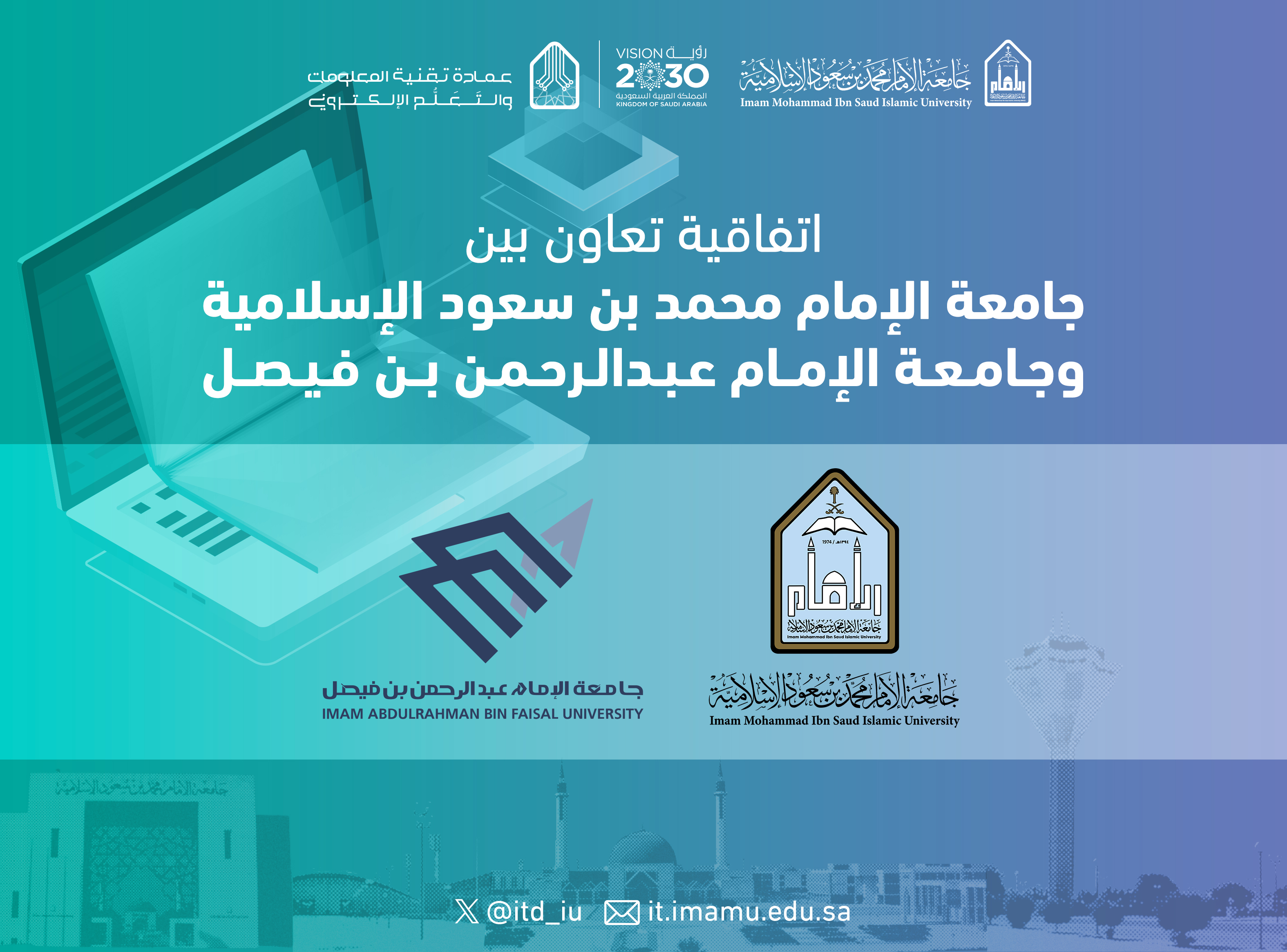 وقّعت جامعة الإمام محمد بن سعود الإسلامية، ممثلةً بعمادة تقنية المعلومات والتعلم الإلكتروني، اتفاقية تعاون مع جامعة الإمام عبد الرحمن بن فيصل، ممثلةً بعمادة التعليم الإلكتروني والتعلم عن بُعد؛ بهدف تعزيز التعاون المشترك بين الجامعتين في مجالات التعليم الرقمي .